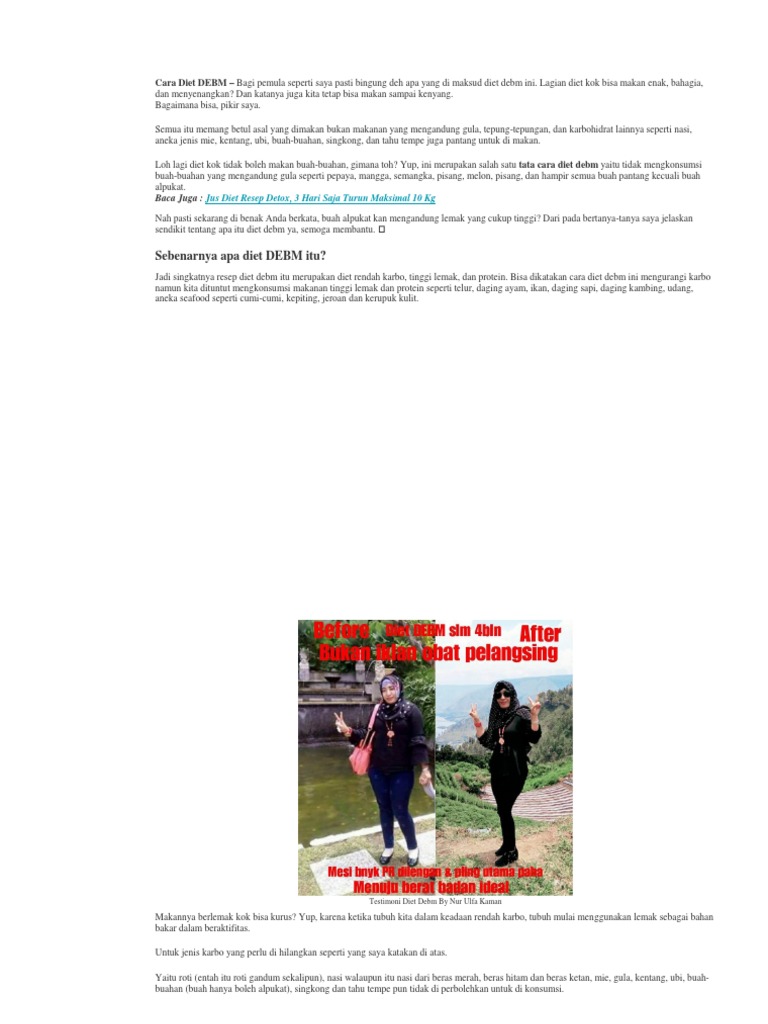 Bisa dikatakan bahwa cara diet ini adalah mengurangi karbo namun kita dituntut untuk mengkonsumsi makanan tinggi lemak dan protein. Dari sekian banyak orang baik itu pria ataupun wanita pasti menginginkan tubuh ideal. Dalam buku debm diet enak bahagia menyenangkan cara mudah turunkan berat banda tanpa sengsara karya robert hendrik liembodo diungkapkan bahwa diet ini cocok untuk yang hobi makan malas olahraga tapi cita citanya selalu ingin ramping dan menawan.