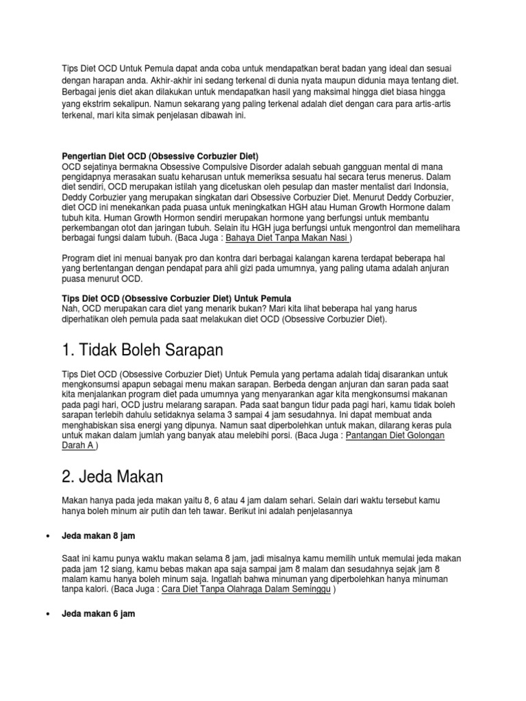 Cara benar melakukan diet ocd obsessive corbuziers diet ocd adalah program diet yang dikenalkan oleh sang mentalist ternama indonesia deddy corbuzierdiet ocd digadang gadang bisa mampu menurunkan berat badan hingga 4 kg dalam seminggu. Ocd merupakan akronim dari obsessive corbuziers diet ocd yang dikenalkan dan dipopulerkan oleh mentalist ternama indonesia deddy corbuzier. Setelah dan selama puasa anda hanya diperbolehkan mengonsumsi air putih sampai waktu jendela makan keesokan harinya.