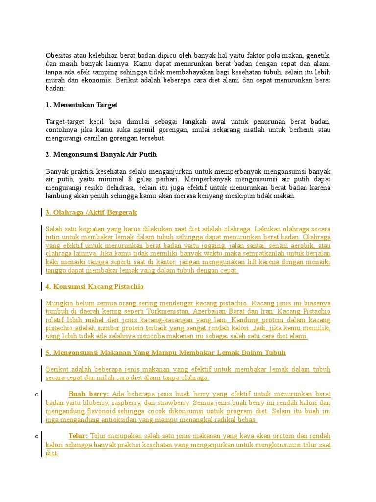 Cara diet efektif tanpa olahraga. Cara menurunkan berat badan secara alami dengan diet. Tujuan dari diet ini yaitu membuat selera makan turun karena makanan yang di konsumsi jadi lebih sedikit dibanding dengan hari hari sebelumnya. Pilih menu makan yang tepat.